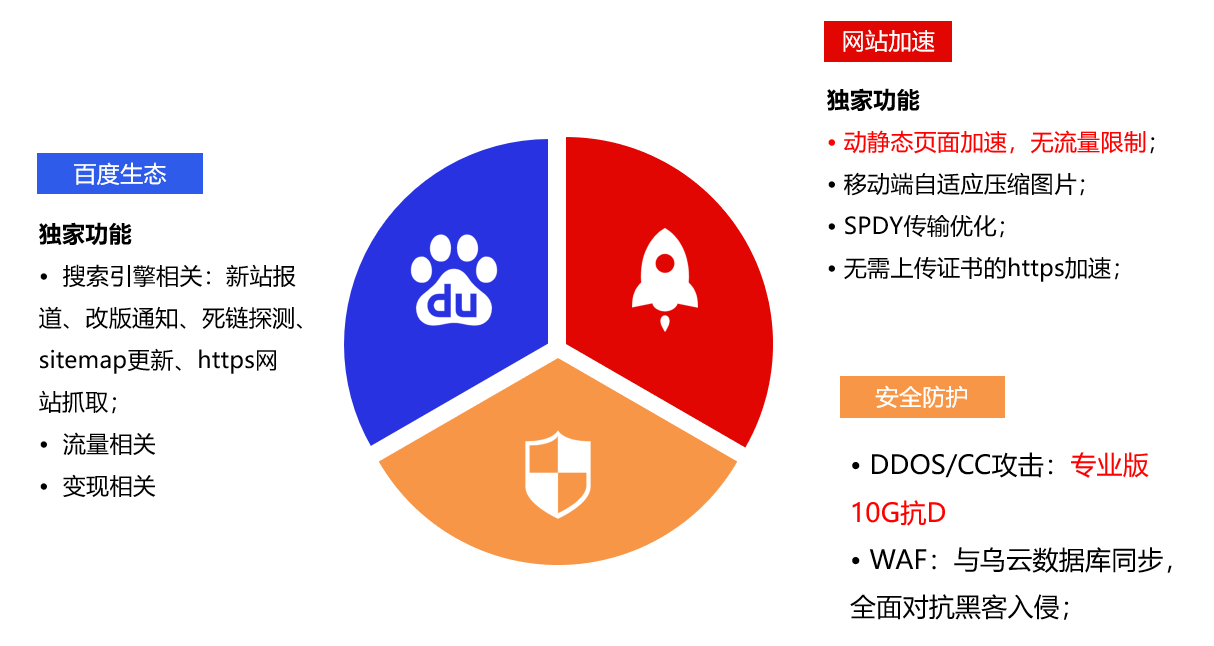 百度云加速是百度旗下为网站提供一站式加速、安全防护和搜索引擎优化的产品。百度云加速正为数十万用户的近百万网站提供CDN、网络安全和SEO服务。每天处理十亿级的PV流量及数百亿TB的数据流量,并提供市场顶尖水平的稳定性和抗攻击能力。