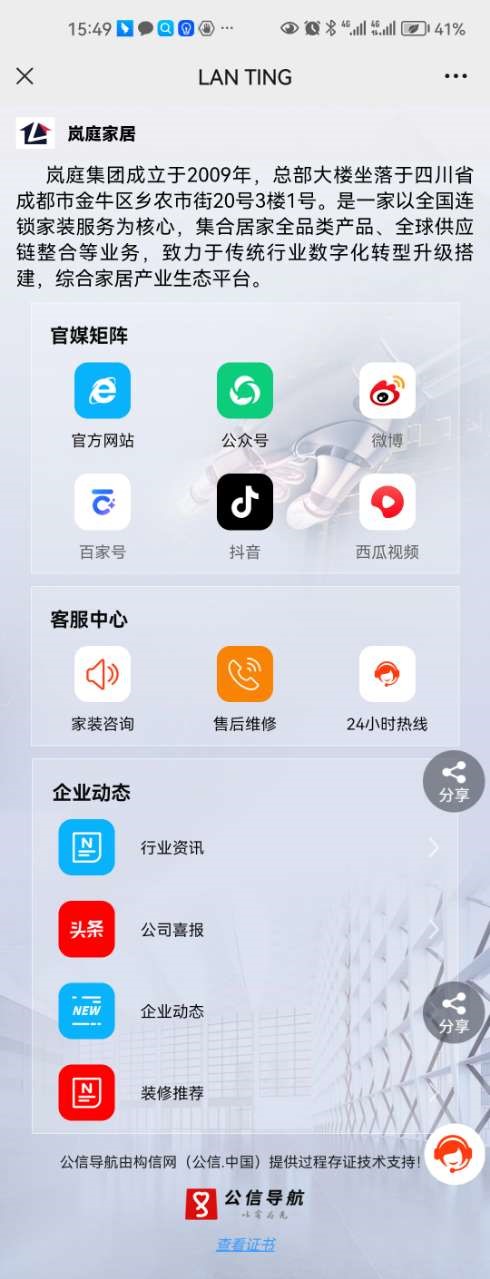 在移动互联时代,传统的营销方式已难以满足消费者的多元化需求。媒体号和商城号虽然在一定程度上提升了品牌曝光度和销售效率,但它们的分享便利性、用户流量聚合性以及所有权问题却成为阻碍数字化营销效率的难题。基于“.购物”中文域名的创新应用“公信导航”,成功消除了这三大难题。“公信导航-购物版”是购物域名注册管理机构与构信网(公信.中国)为单位量身定制的单位公共信息入口导航服务,将单位的公众号、微博、抖音、京东、淘宝、官网、邮箱、电话等所有官方媒体号和商城号聚合在单一页面直接访问,统一访问入口。用户仅需通过手机扫描岚庭家居官方公信导航码,或在移动端浏览器地址栏输入“岚庭家居.购物”域名,即可一站直达岚庭家居的商业版图,轻松实现自媒体的关注、分享和切换。