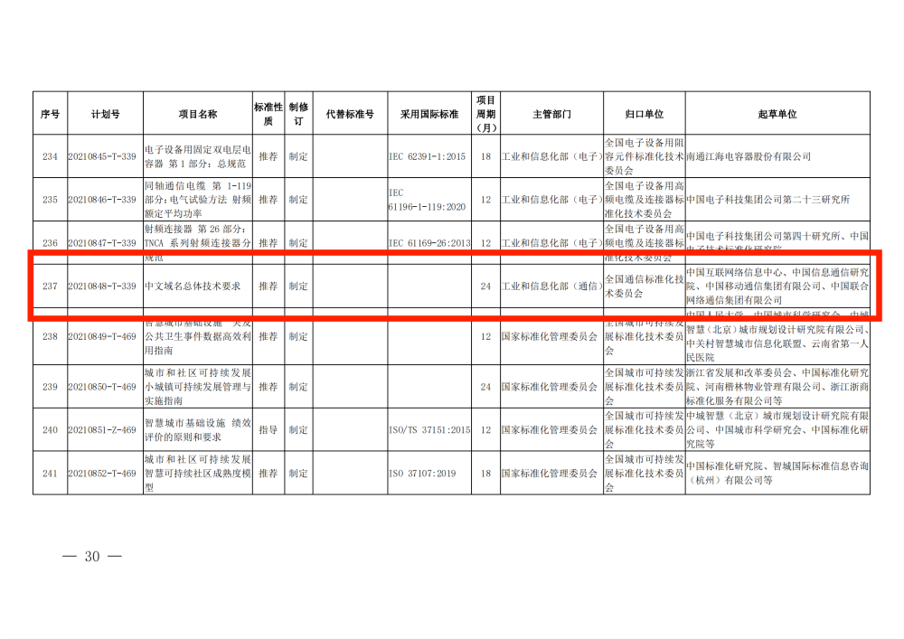 2021年4月30日,国家标准化管理委员会(简称国标委)下达2021年第一批588项推荐性国家标准计划及相关标准外文版计划(国标委发〔2021〕12号),批准中文域名总体技术要求国家标准立项。